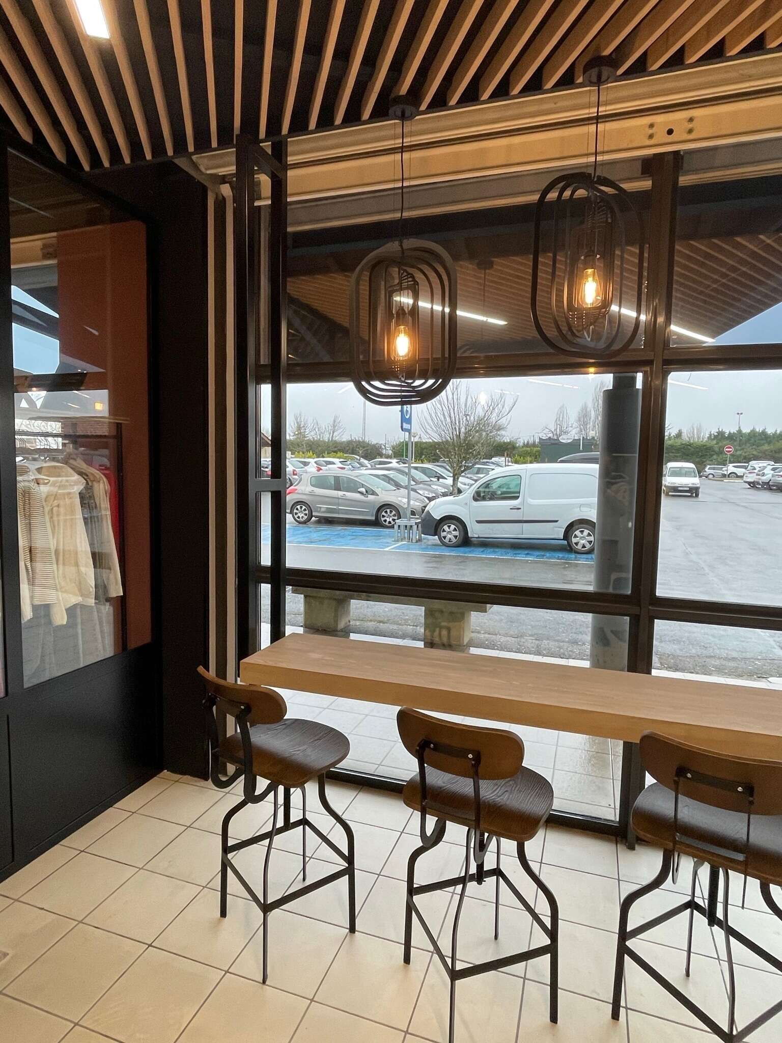 Réalisation sur-mesure d'une table suspendue en chêne massif pour le hall d’entrée de Super U.