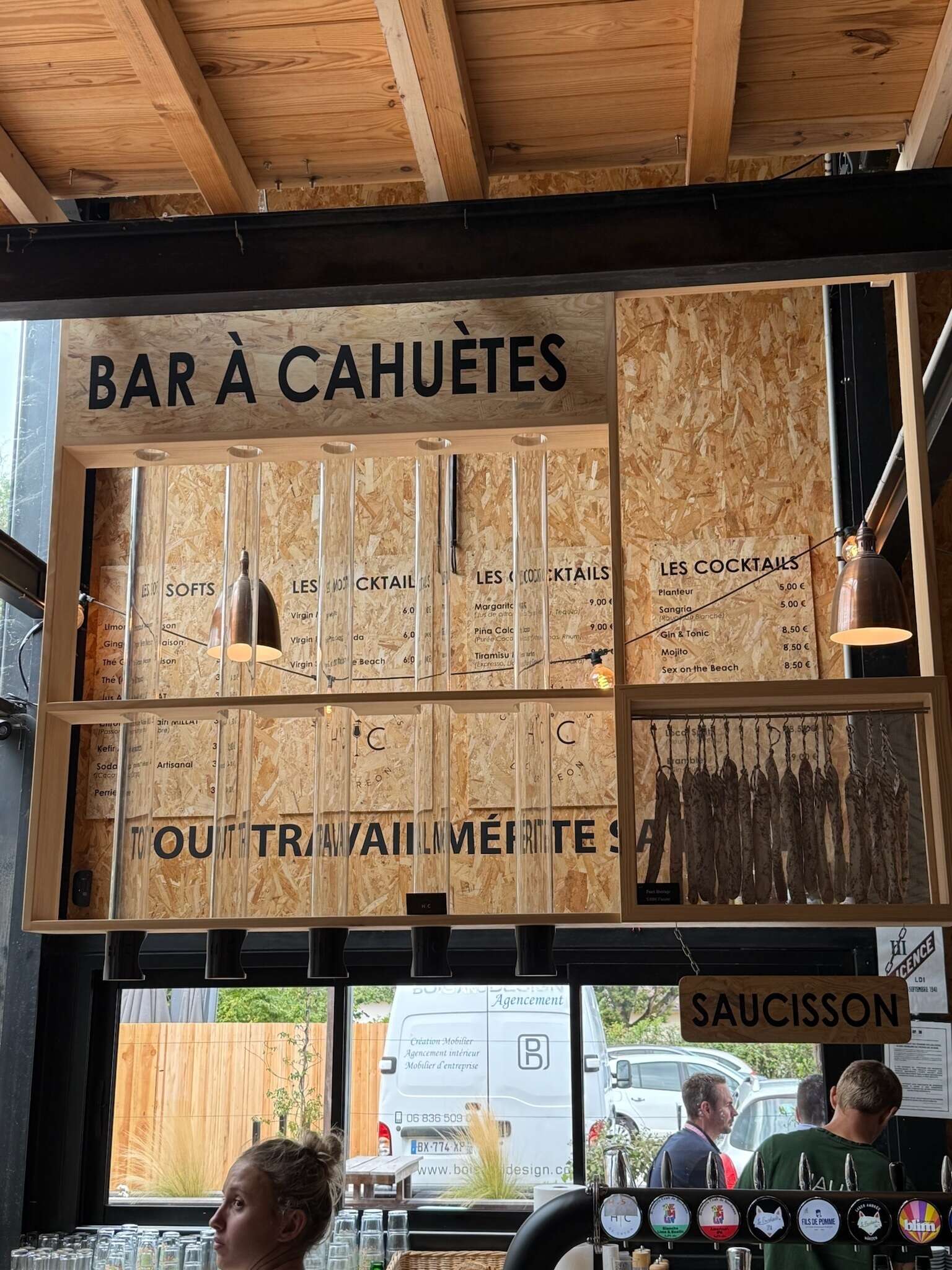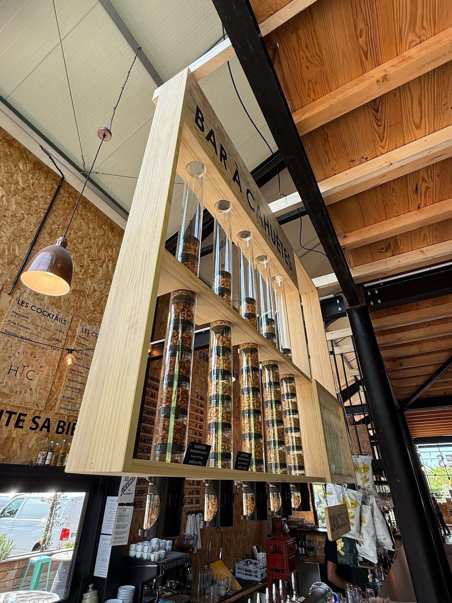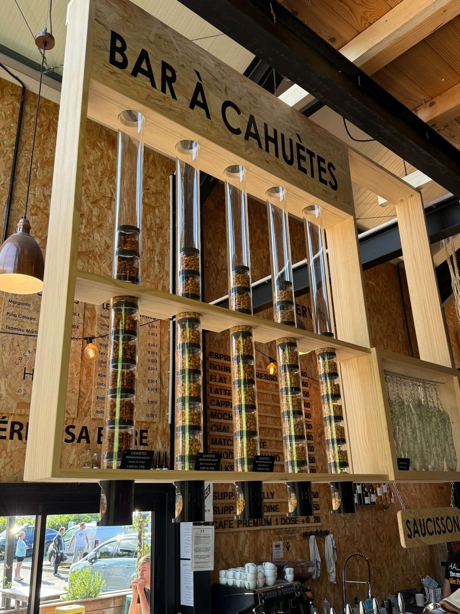 Réalisation sur-mesure pour les halls de Cenon : un bar à cacahuètes conçu comme une pièce à la fois fonctionnelle et conviviale.