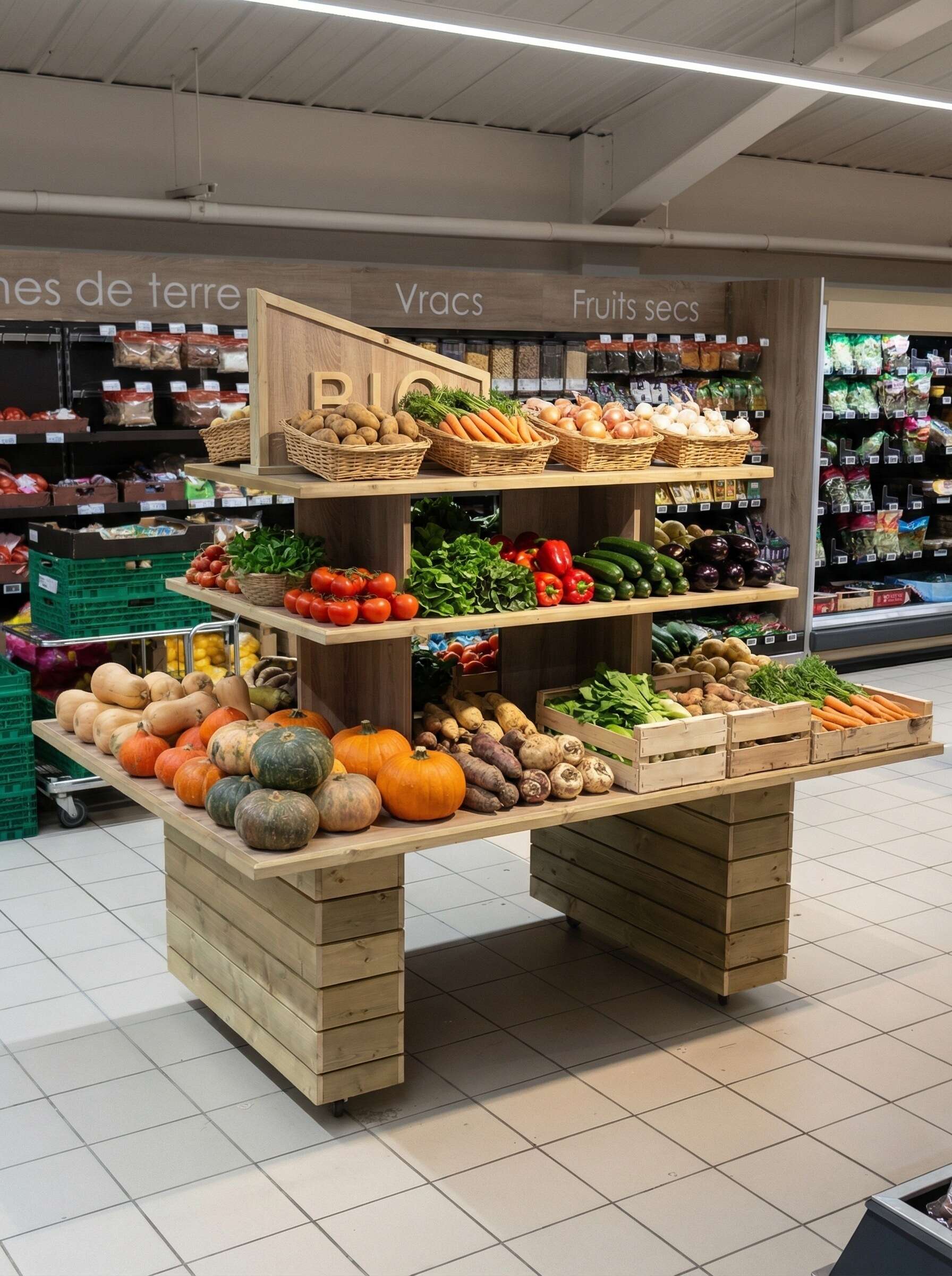 Conçu et fabriqué dans notre atelier, ce meuble a été développé pour la présentation et le stockage de fruits et légumes en espace de vente. L’agencement a été étudié afin de faciliter la mise en place des produits, leur accessibilité et leur rotation.